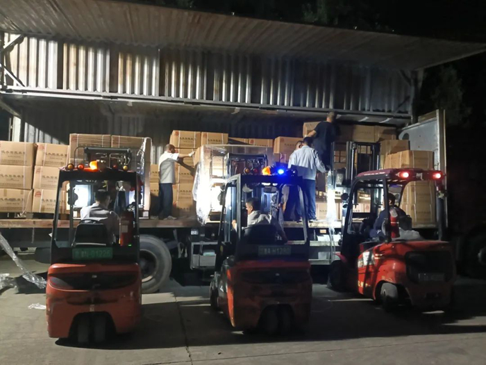 華騰化工立即調(diào)度人力、物力,爭(zhēng)分奪秒組織應(yīng)急物資配送。歷經(jīng)5個(gè)多小時(shí)不間歇備貨、裝載,滿載應(yīng)急物資的4輛大貨車陸續(xù)發(fā)車,前往抗汛一線。